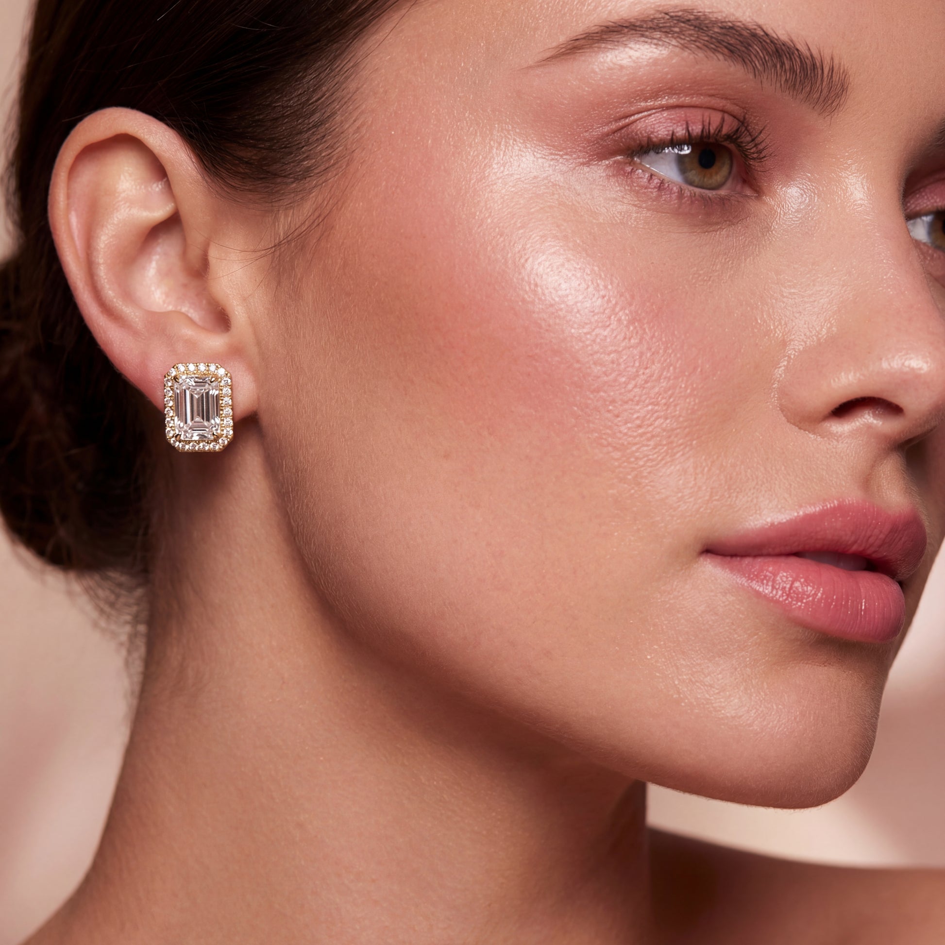 The Elysia Earrings celebrate the refined geometry of the emerald cut. Each step-cut lab-grown diamond is embraced by a halo of brilliant rounds set in polished 18k gold, creating a sophisticated interplay of vintage elegance and modern luxury.