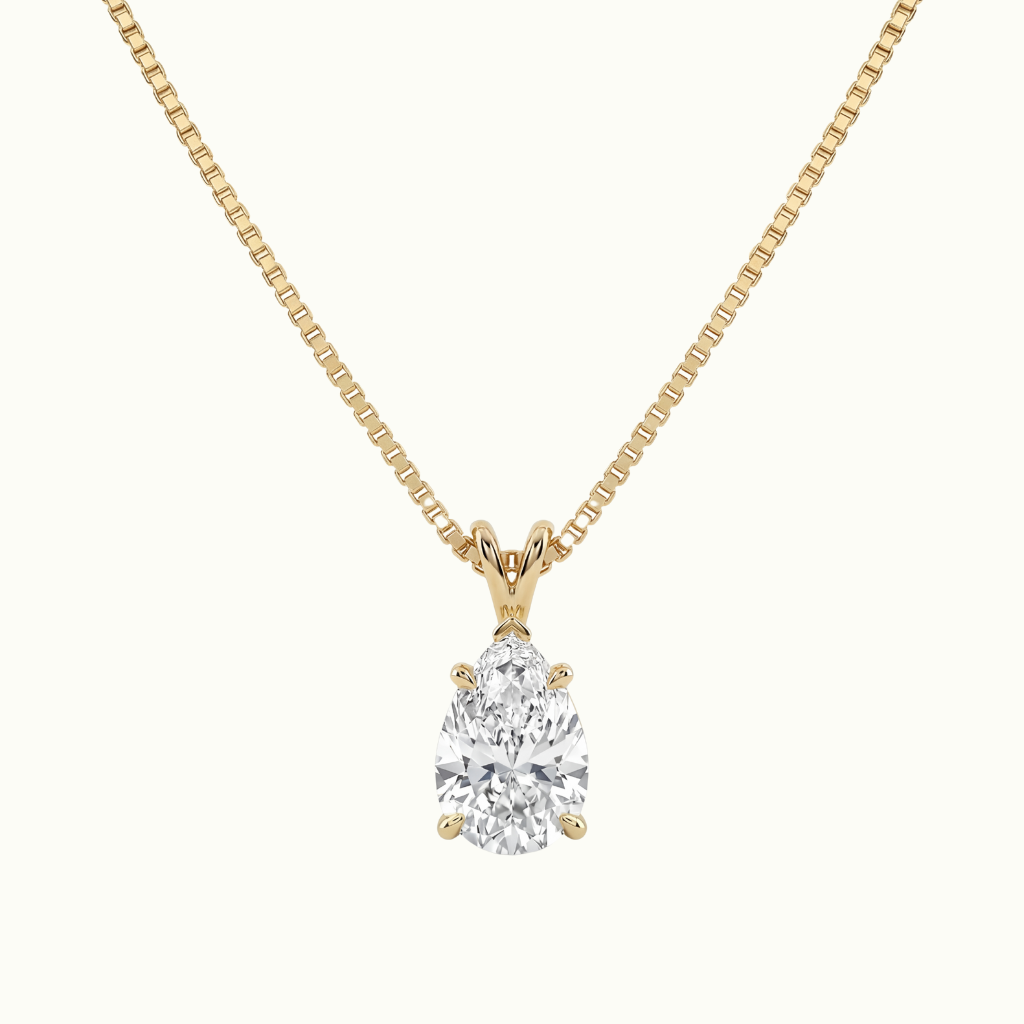 A stunning 3-carat pear-cut lab-grown diamond is set in polished 18K gold, suspended from a classic box chain that highlights the stone's exceptional fire and clarity.
