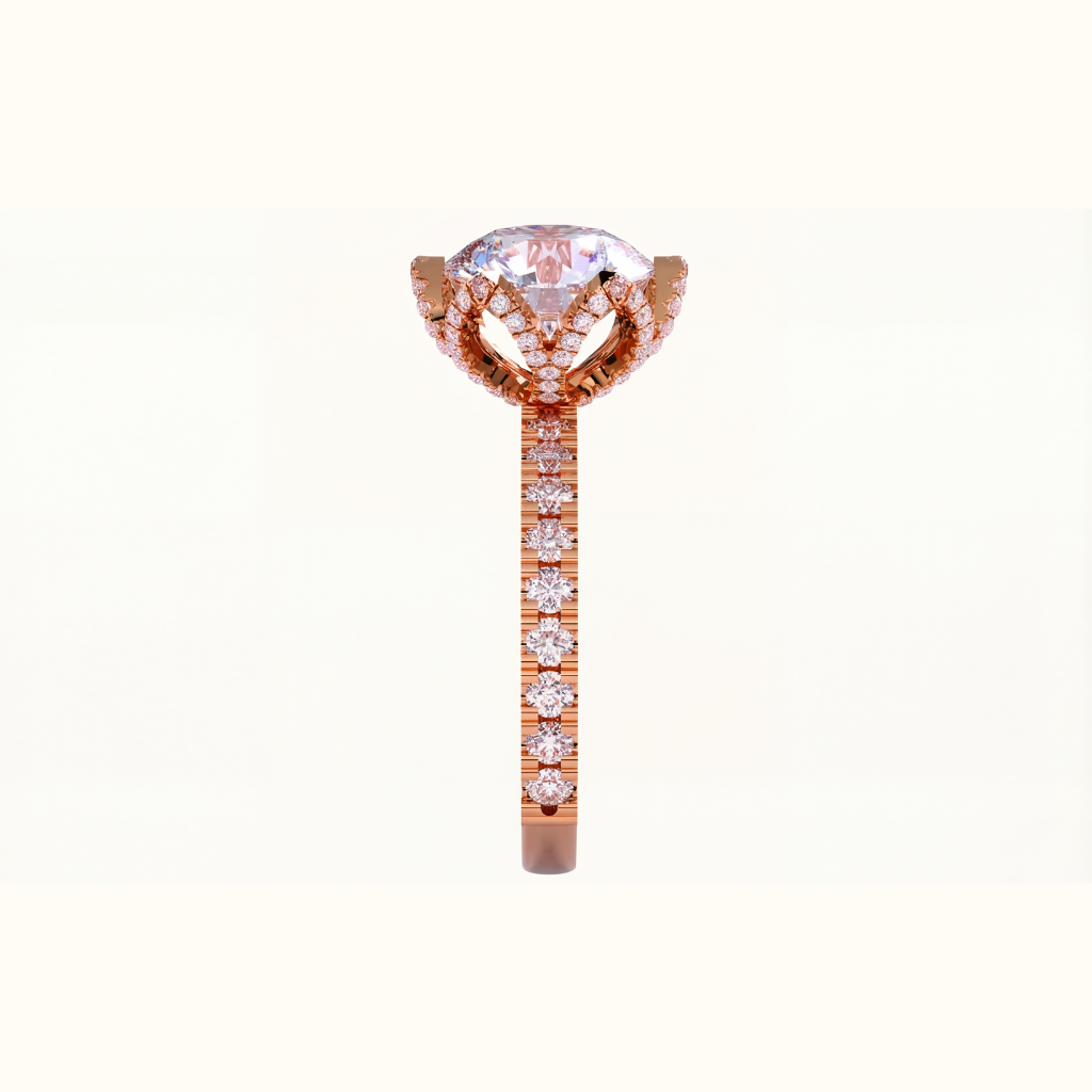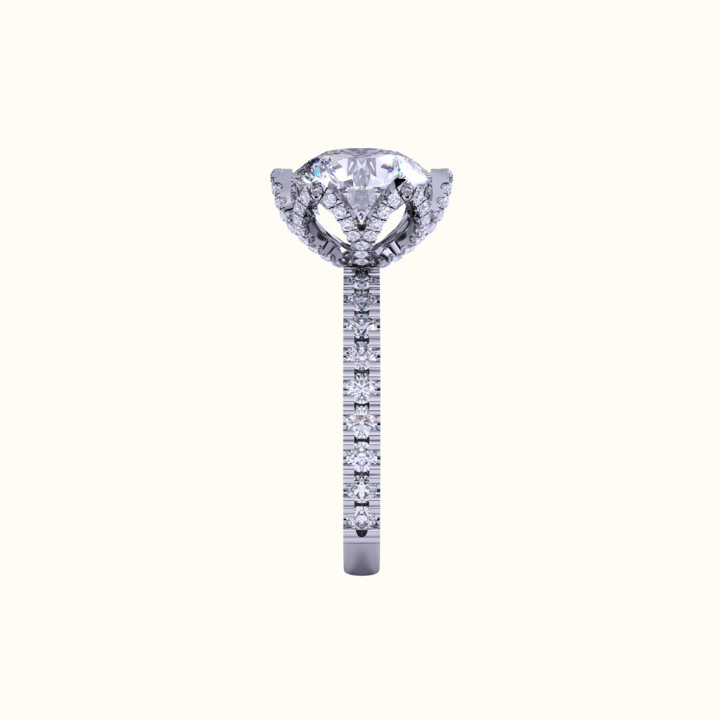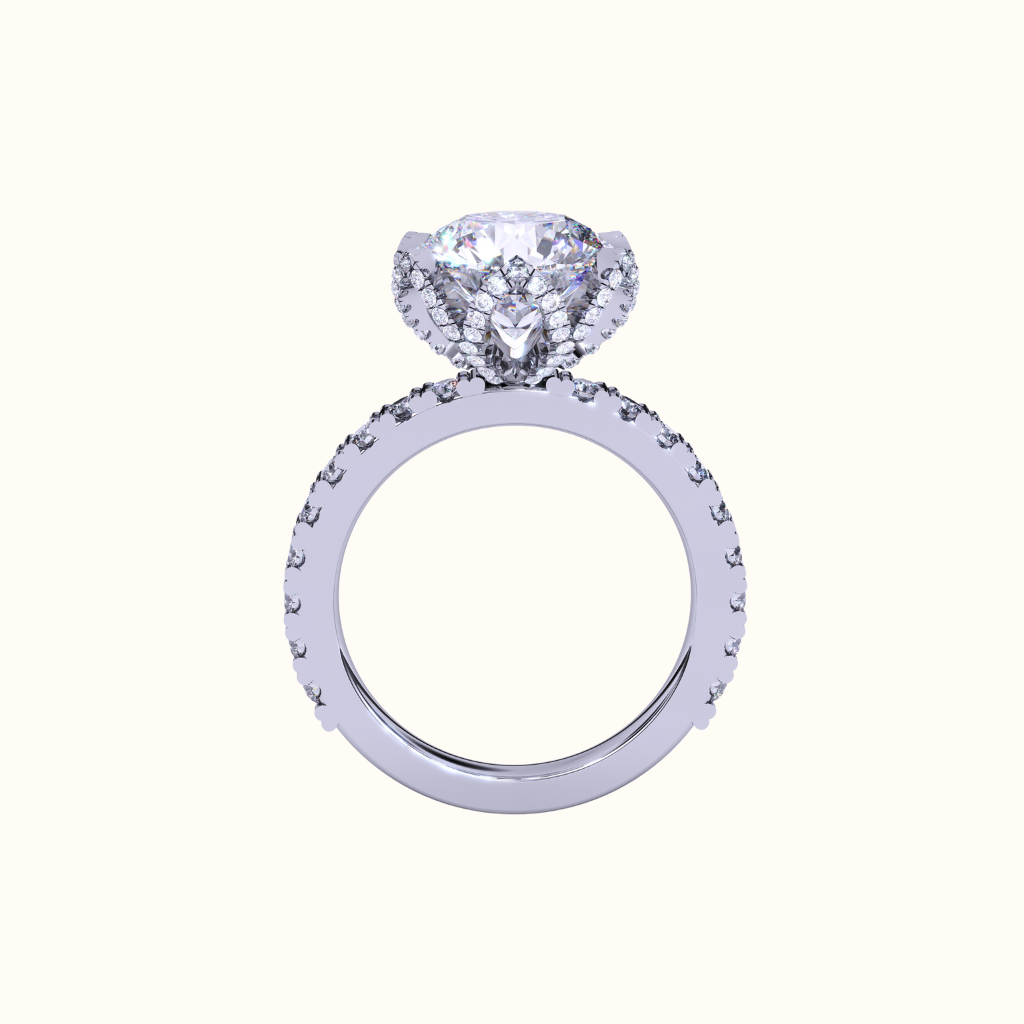 Delicate pavé diamonds bloom along the petals and continue down a half-set band for a refined, radiant finish.