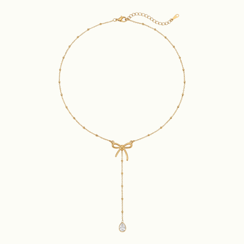 A delicate 18K gold bow motif suspends a brilliant pear-cut lab-grown diamond on a fine beaded chain, creating a graceful lariat silhouette.