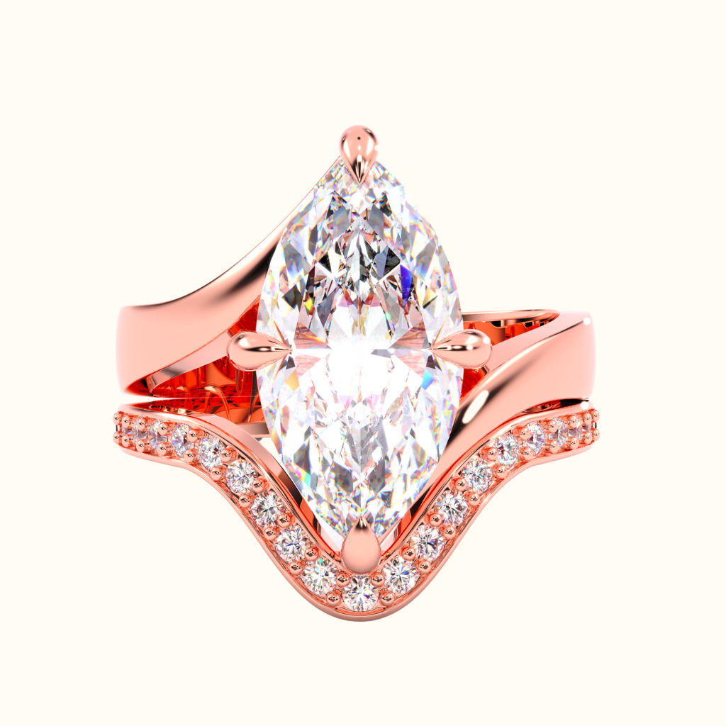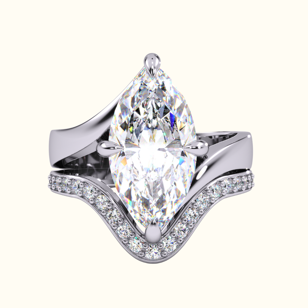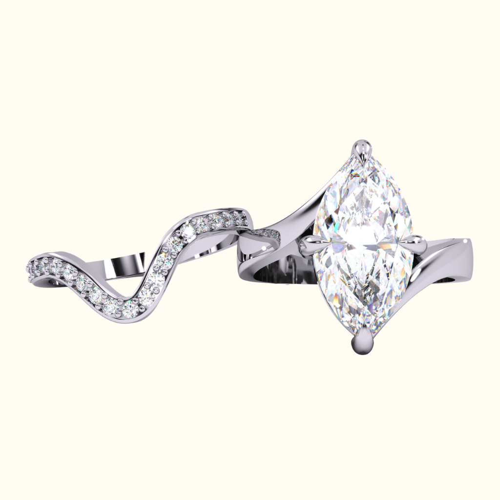 It features Caia, a sculptural engagement ring with a striking marquise-cut diamond, paired with Valea, a curved pavé band that fits seamlessly by its side. Together, they represent connection, contrast, and the beauty of two pieces coming together in perfect harmony.