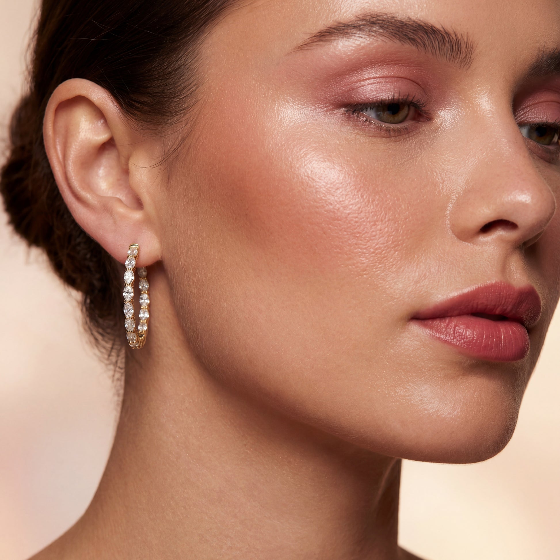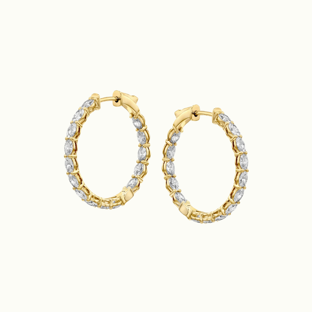 A continuous row of oval-cut lab-grown diamonds is individually set in polished 18k gold, creating a 25mm hoop that radiates brilliance with every movement while maintaining an elegant, wearable scale.