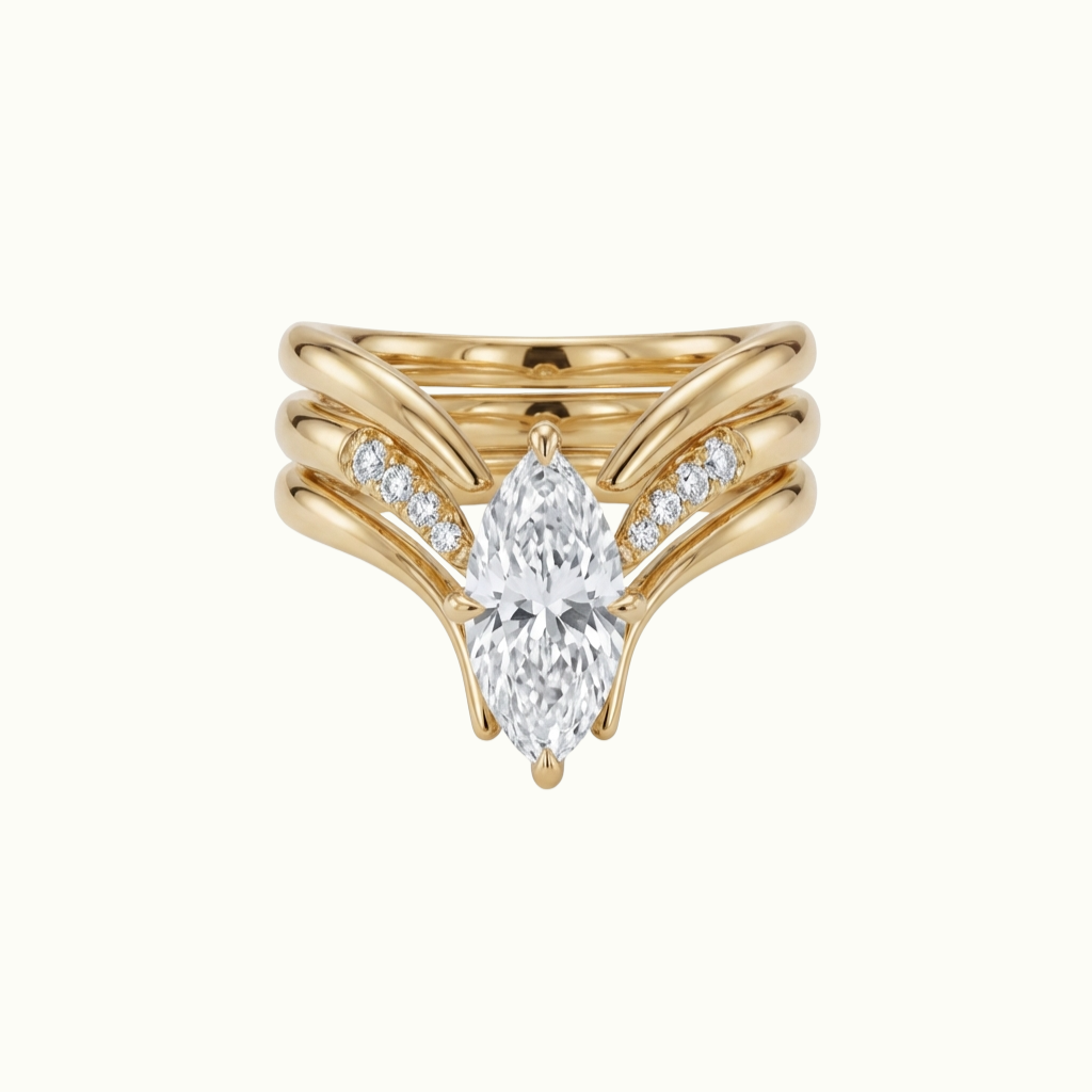 The Vespera Ring Set embodies bold sophistication with a stunning 2-carat marquise-cut lab-grown diamond, dramatically framed by a chevron-inspired triple band design in polished 18K yellow gold.